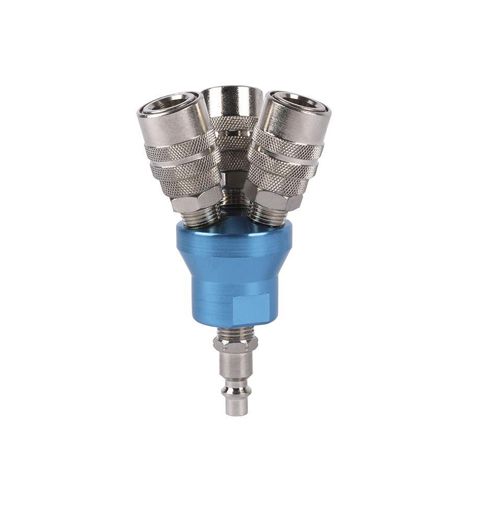 Acoplamento rápido com 3 saídas em flor ou em círculo. Recomendado para instalações onde vários tubos podem ser ligados à mesma fonte de alimentação de ar e ocupam menos espaço na tomada. Fabricado de aço endurecido tratado termicamente com uma superfície banhada a níquel que pode resistir à ferrugem e corrosão.