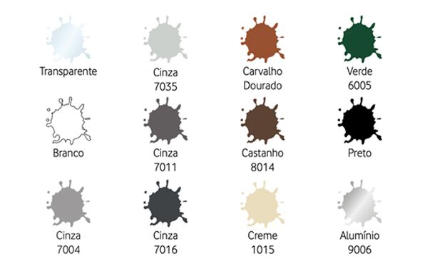 - TRANSPARENTE, BRANCO, CINZA 7004, CINZA 7035, CINZA 7011, CINZA 7016, CARVALHO DOURADO, CASTANHO 8007, CASTANHO 8014, BRONZE 8017, VERDE 6005, VERDE 6009, VERDE 6200, PRETO, INOX, ALUMÍNIO 9006